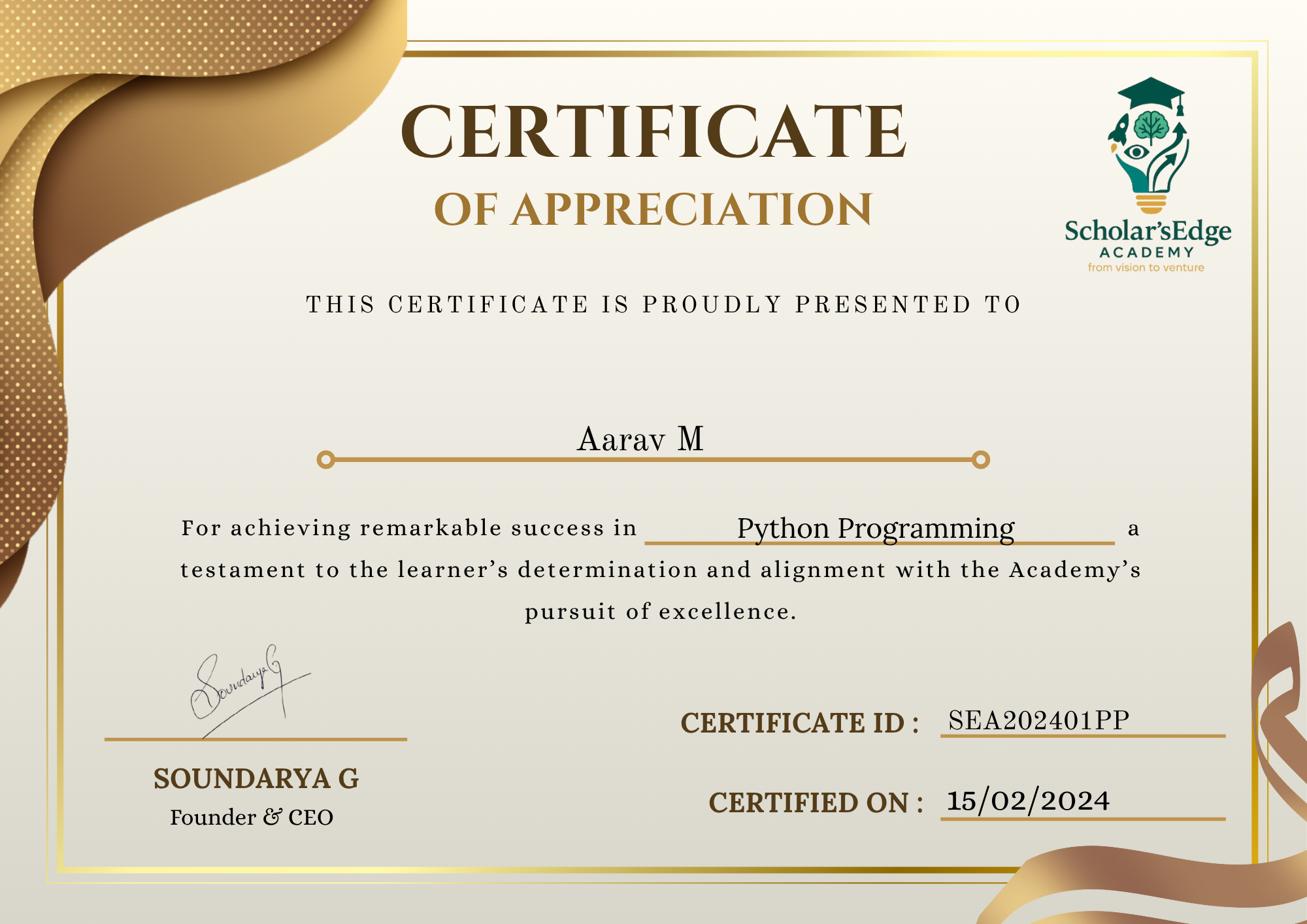 Enrolling in the Python + AI course changed my life. I went from knowing nothing about programming to building real AI projects. Within 2 months of finishing the course, I secured an internship at a startup. Scholar’sEdge helped me turn curiosity into confidence.