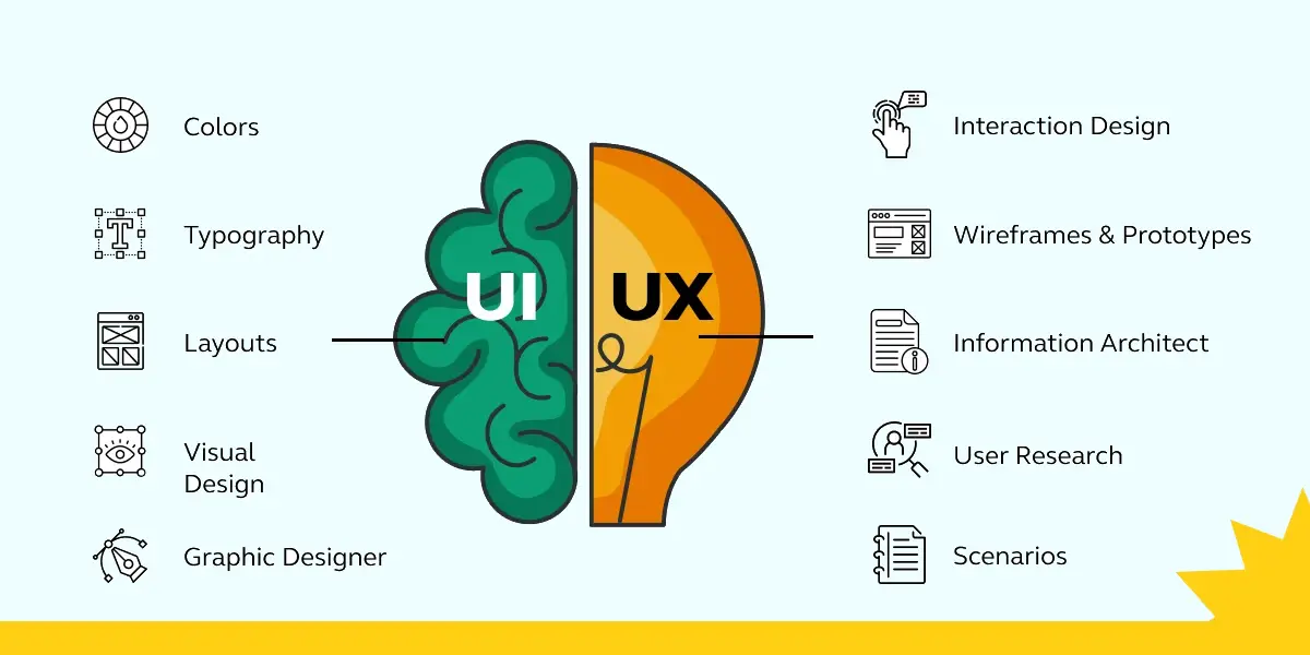 UX (User Experience) focuses on user research, personas, journey maps, and usability. UI (User Interface) is about visual design, color theory, typography, and creating interfaces users interact with.
